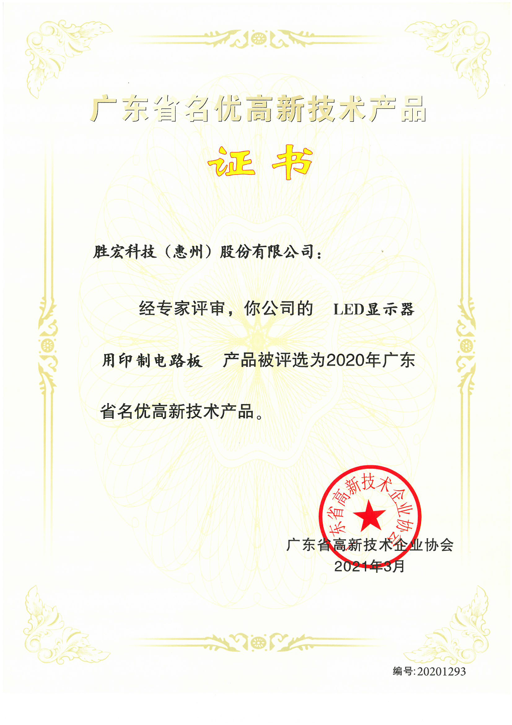 “LED顯示器用電路板”名優(yōu)高新技術(shù)產(chǎn)品證書